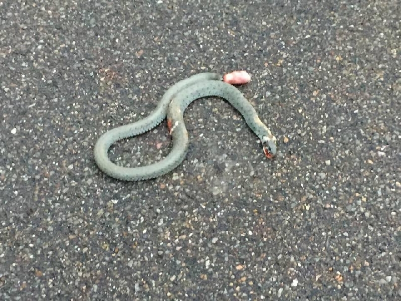 Als wir an der Einsatzstelle eintrafen, fanden wir eine angefahrene Schlange vor. Ein Kamerad entfernte die Schlange mit einem geschulten Griff von Straße und legte sie in eine Transportbox.